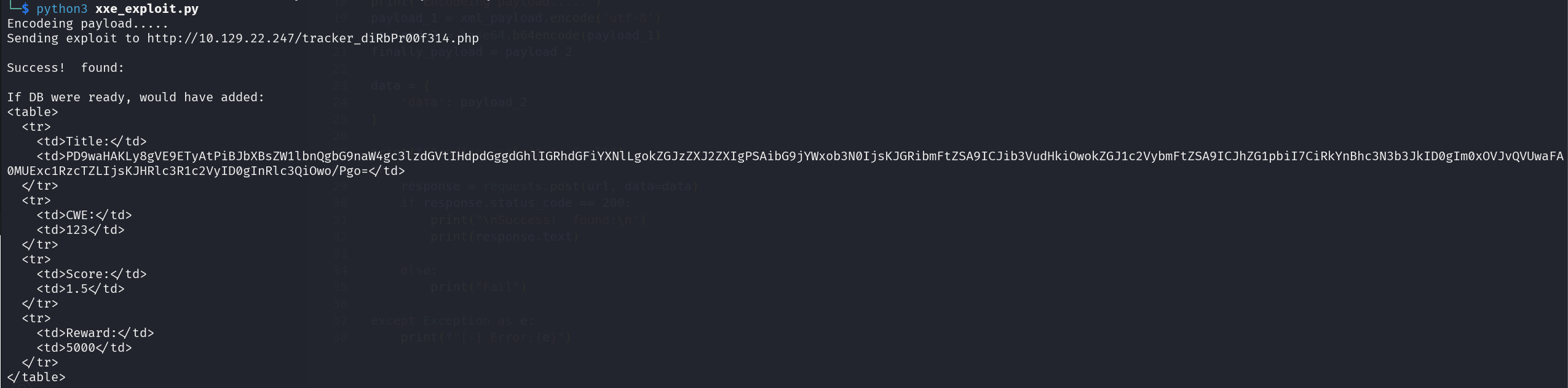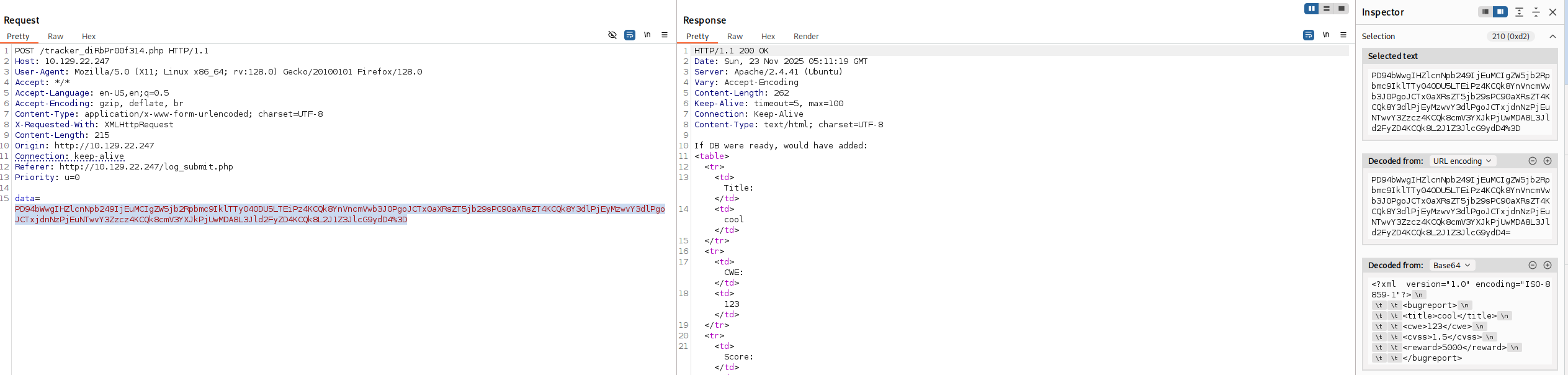 中間有個下載的guide但點擊後沒東西是個死按鈕 點擊portal的頁面 ,看網頁上寫著 Portal under development還在開發,並告訴我們點here就能到 bounty tracker 點擊here 會看到 Bounty Report System 試著送出資料以及使用burpsuite攔截過程 從攔截得過程可以看出是送出XML的內容,那看到XML的內容就要想到XXE,先確定能不能讀取etc/passwd才行,