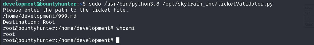 成功進來ssh之後使用sudo -l 有一個使用python3.8執行/opt/skytrain_inc/ticketValidator.py的權限 第一個想法是直接取代 但發現沒有修改的權限 先看裡面怎麼寫的